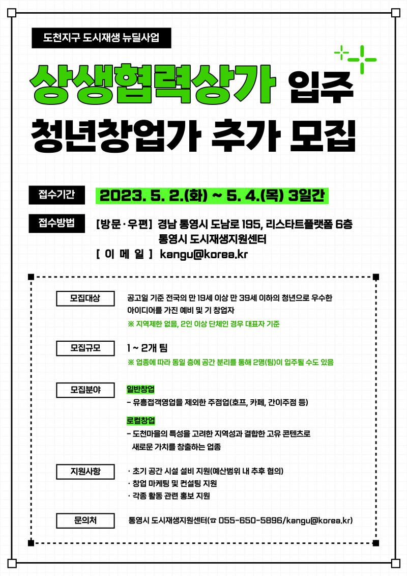 도천지구 도시재생뉴딜 청년둥지틀기사업의 일환으로 구도심 상권 활성화를 위하여 조성되는「상생협력상가」에 입주할 열정과 참신한 아이디어를 가진 청년창업가를 추가 모집하오니 많은 관심과 지원바랍니다.