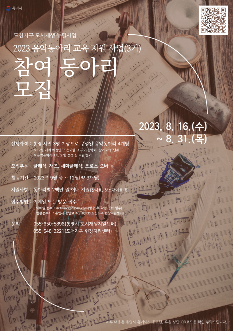도천지구 도시재생 뉴딜사업「음악이 흐르는 도천 '마을이야기에 윤이상(음악)을 입히다'」음악마을 활성화 사업 추진에 따른 2023년 음악동아리 교육지원 사업(3기) 참여 동아리를 아래와 같이 모집합니다.