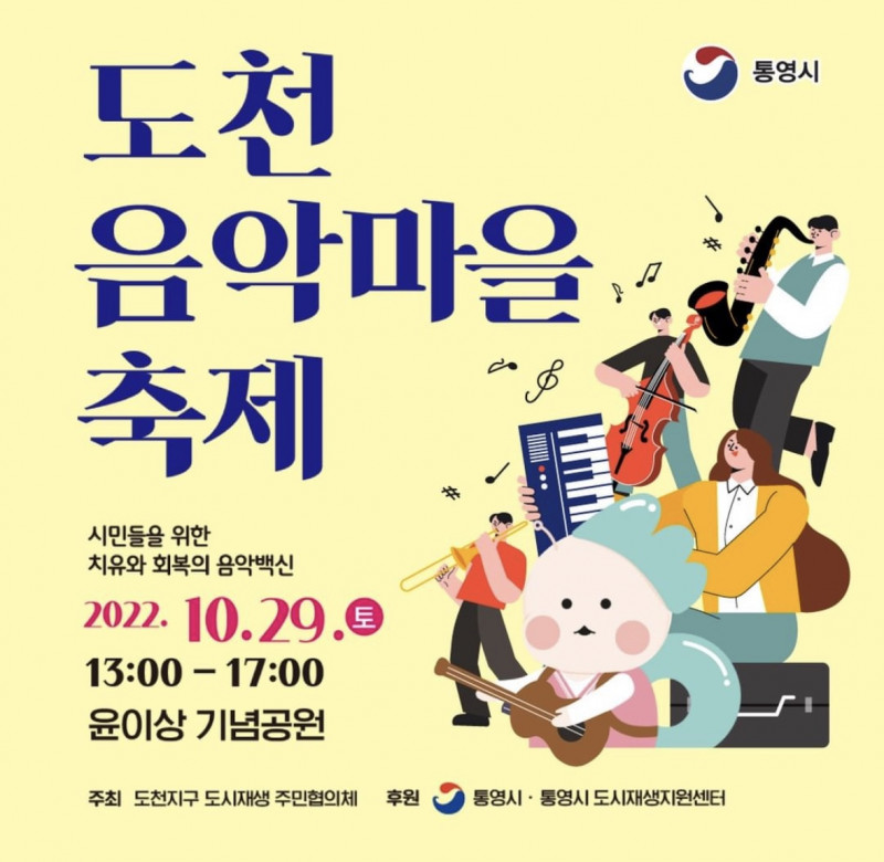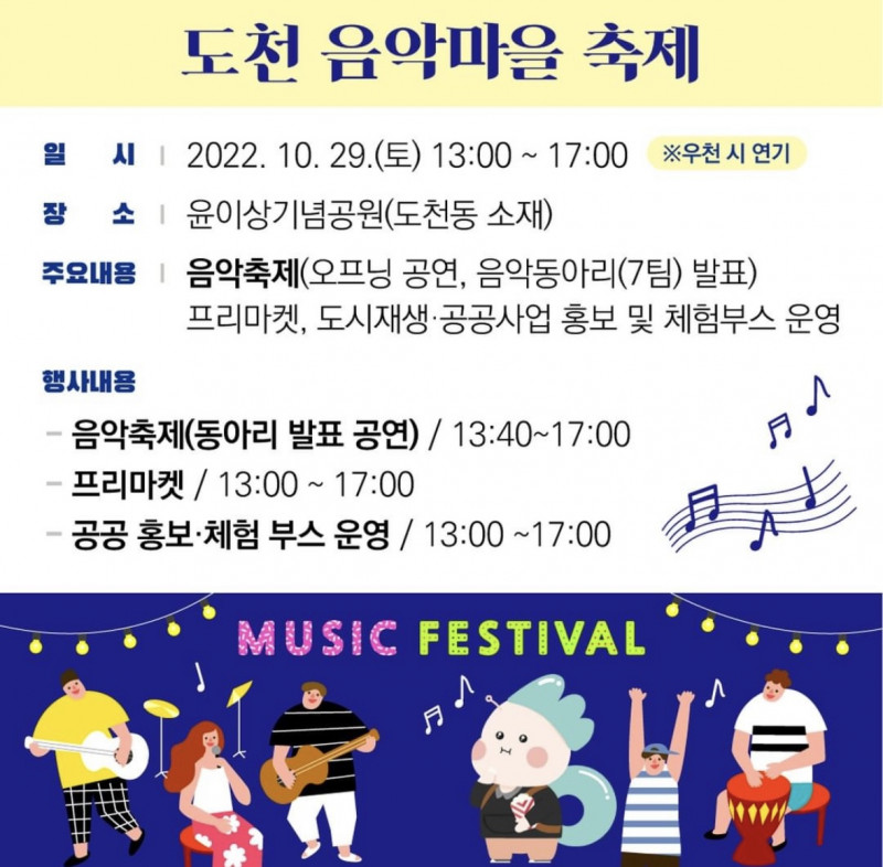 현재 추진 중인 도천지구 도시재생뉴딜사업 단위산업인 음악마을활성화 사업의 일환으로 “도천음악마을축제”를 개최하게 되었습니다. 적극적인 관심과 많은 참여 부탁드립니다.