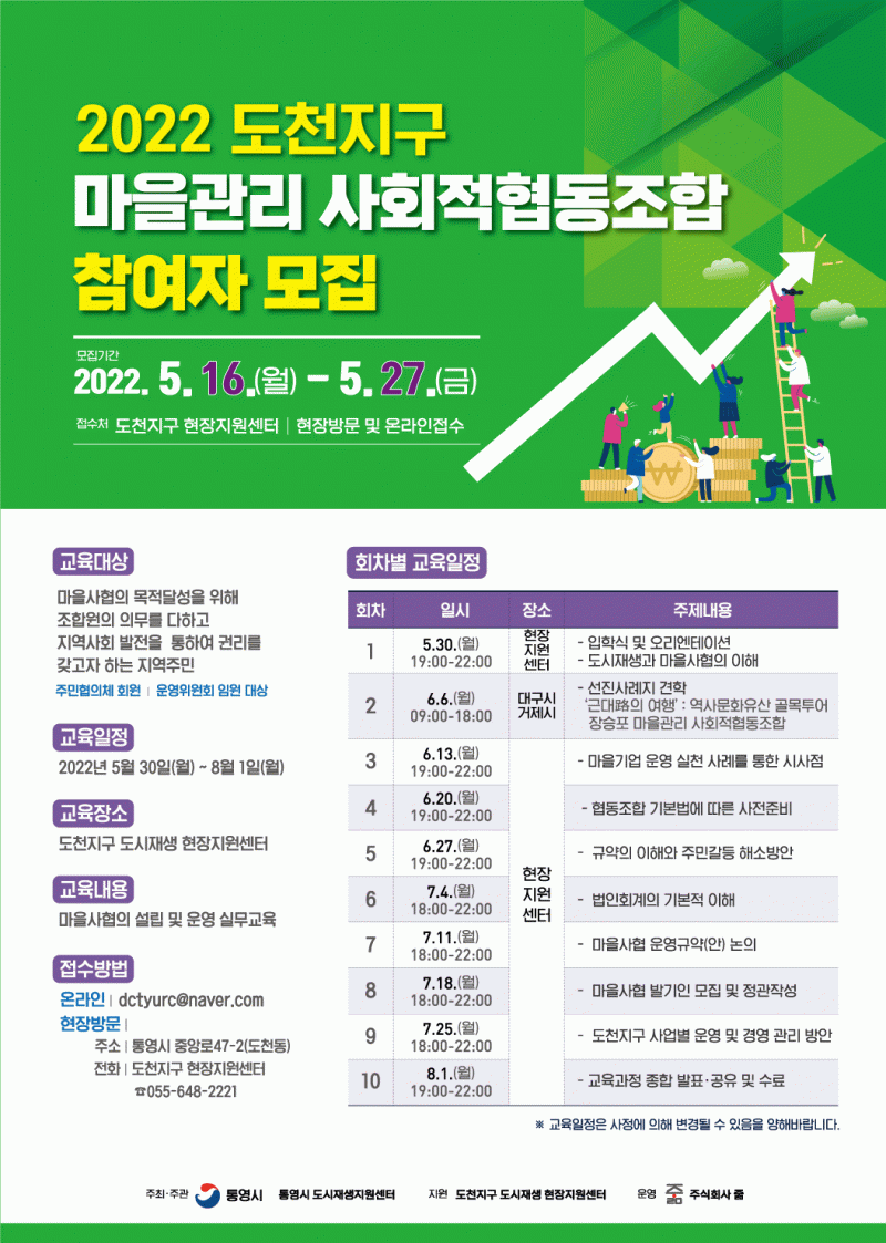 도천지구 마을관리 사회적협동조합 설립을 위한 마을관리 사회적협동조합 설립 전 교육 참여자를 위와 같이 모집합니다.