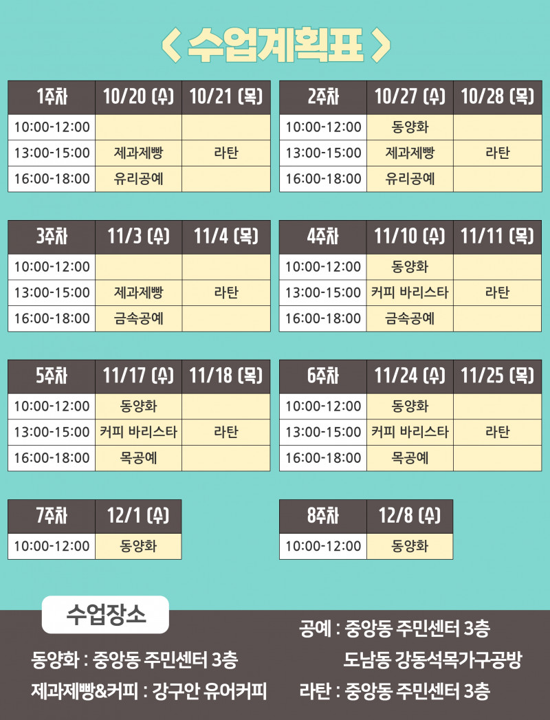 동양화그리기, 커피와 디저트, 공예(유리, 금속, 목공), 라탄공예 분야로 진행하오니