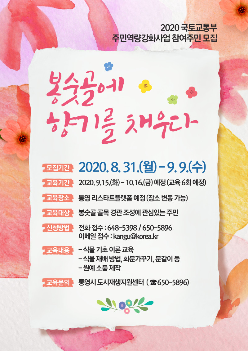 2020 국토교통부 도시재생 주민역량강화사업 '봉숫골에 향기를 채우다' 참여 주민을 모집합니다.