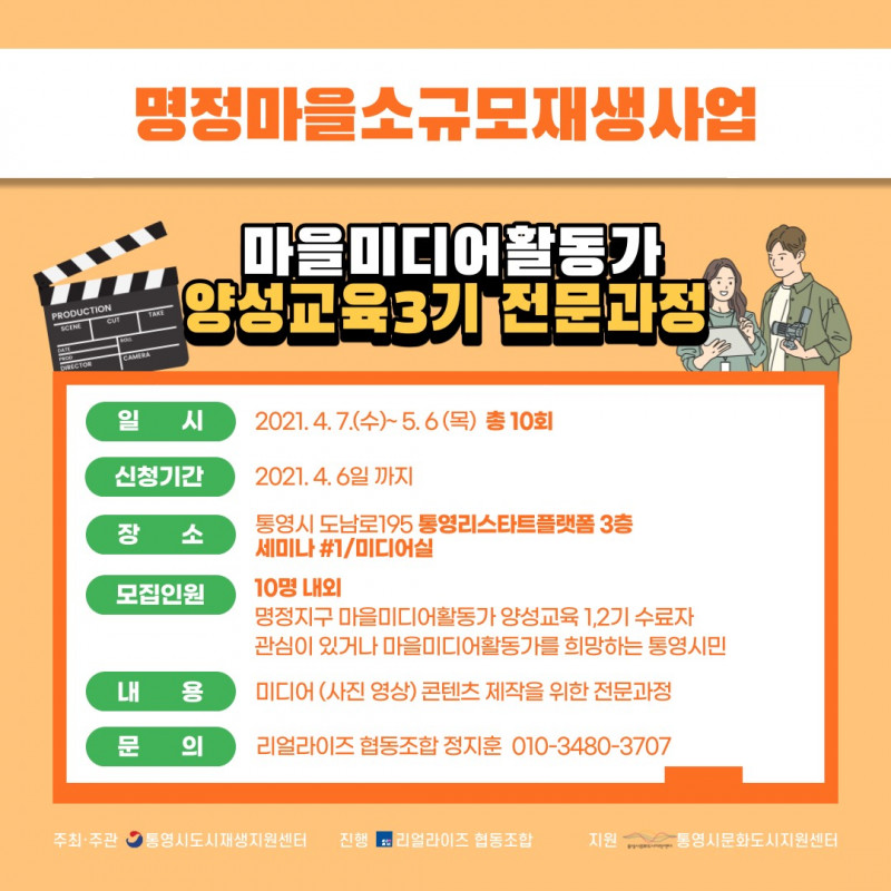 - 모집인원: 10명 내외 (명정지구 마을미디어 활동가 양성교육 1,2기 수료자, 마을미디어에 관심있거나 마을미디어활동가를 희망하는 통영시민)